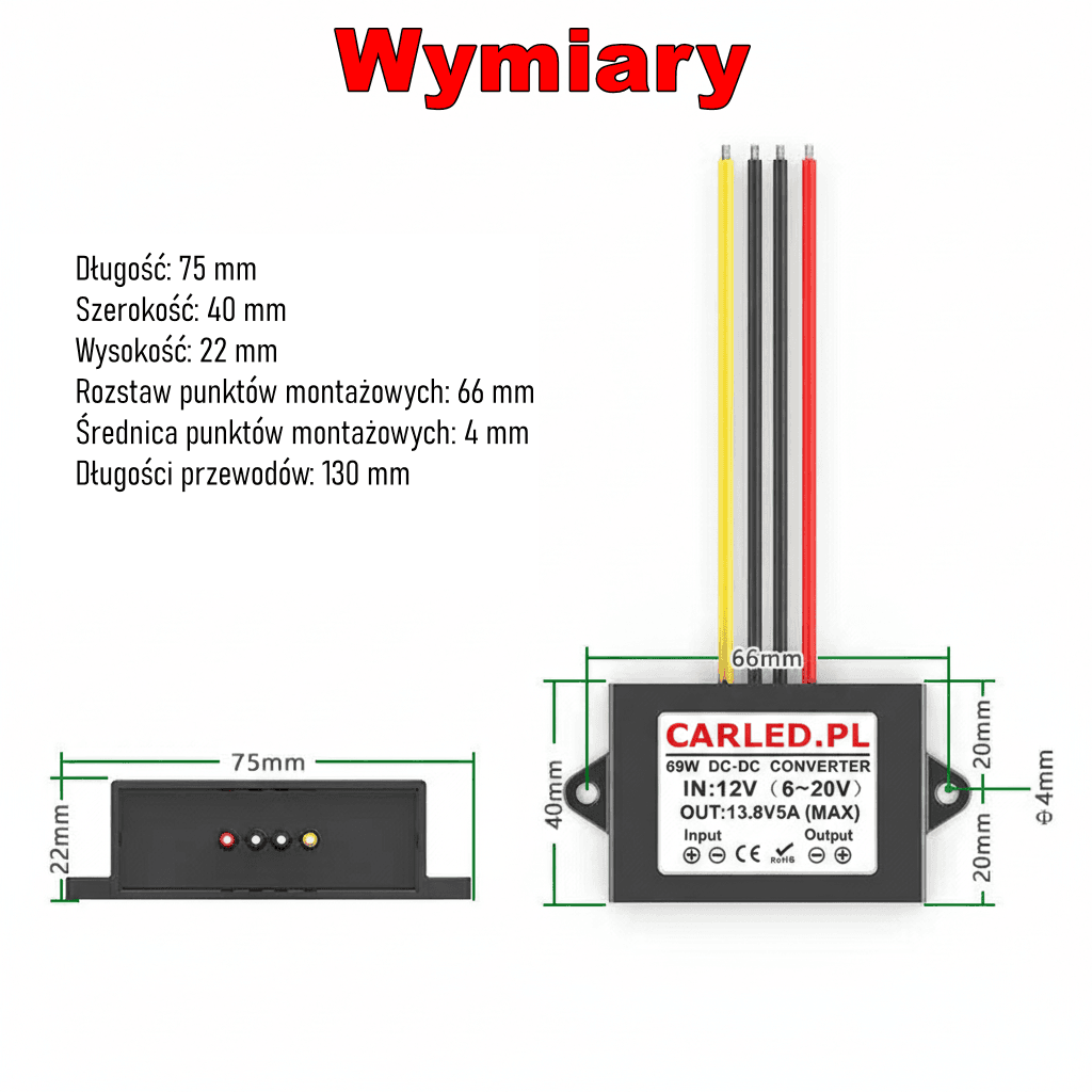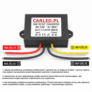 - Wysoka wydajność i moc: Maksymalny prąd wyjściowy wynosi 5A, co przy napięciu 13.8V daje moc całkowitą do 69W. Sprawność konwersji wynosi aż ≥93%.