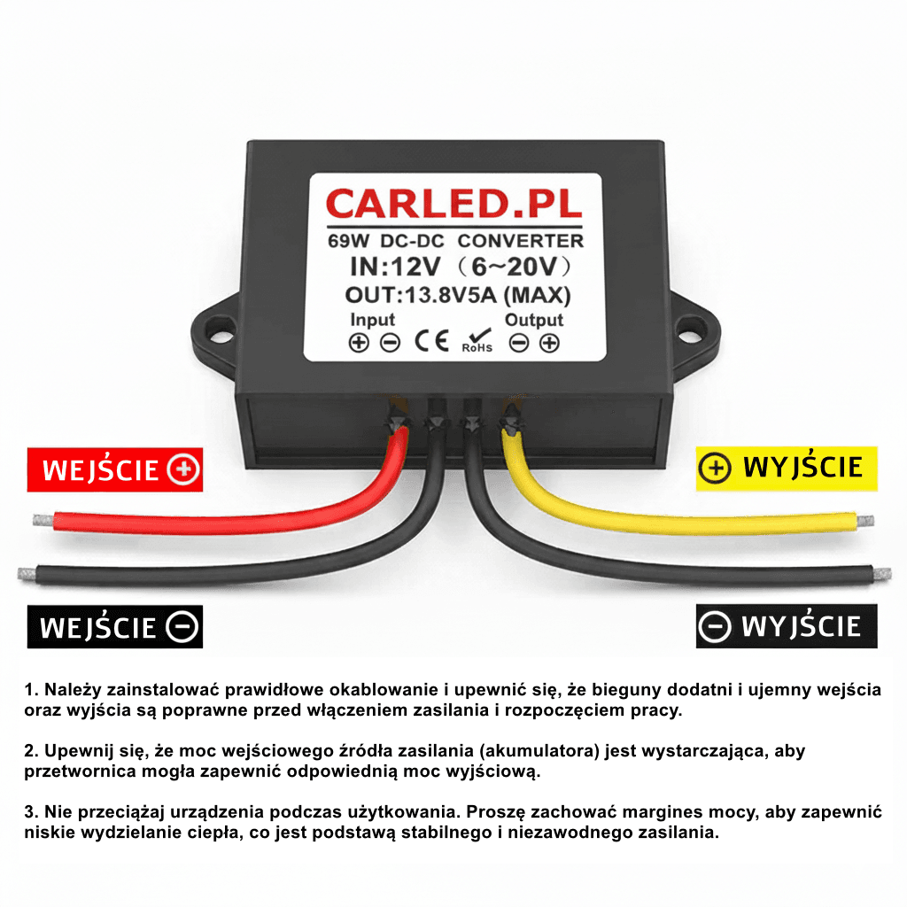 - WEJŚCIE (Input): Przewód czerwony (+) oraz czarny (-).