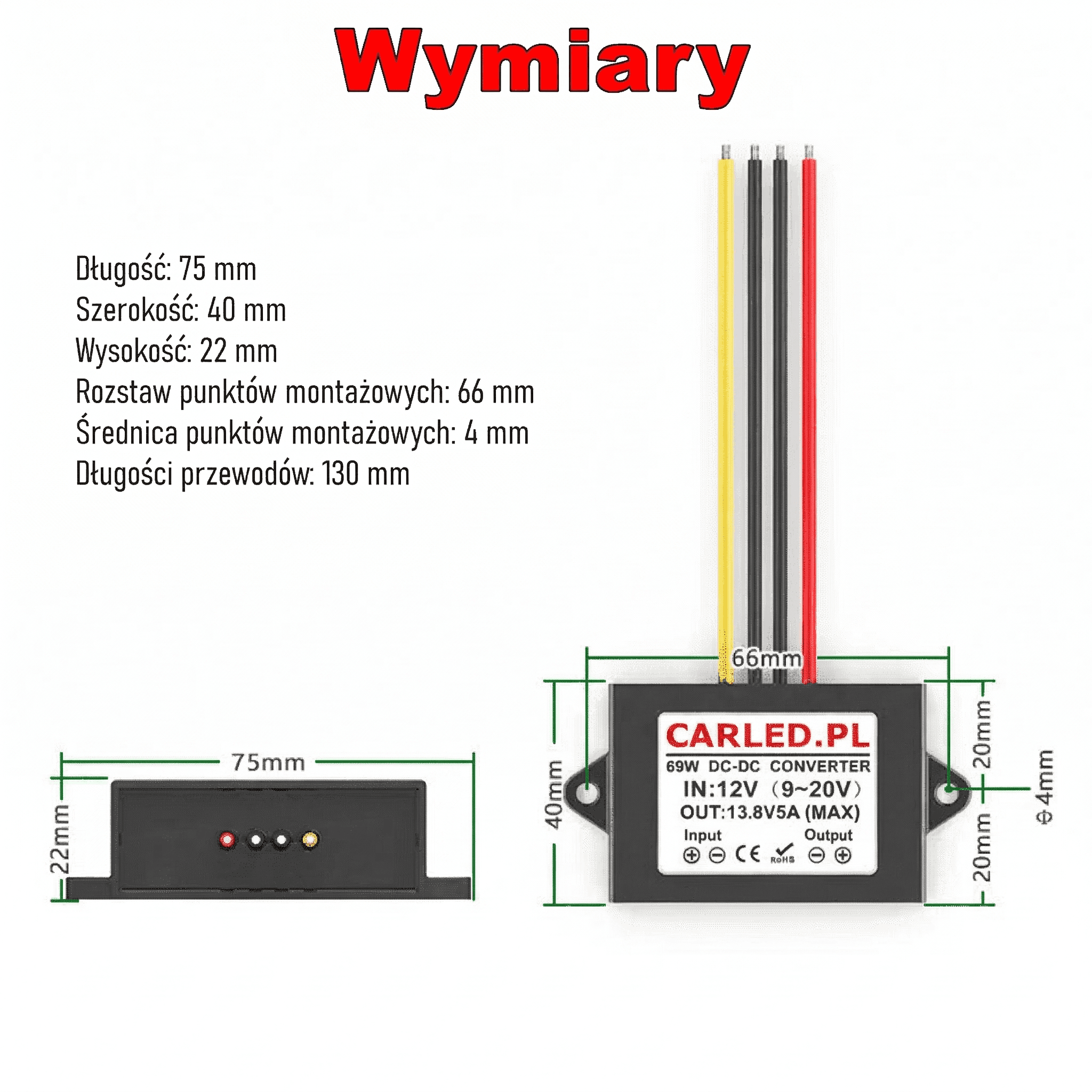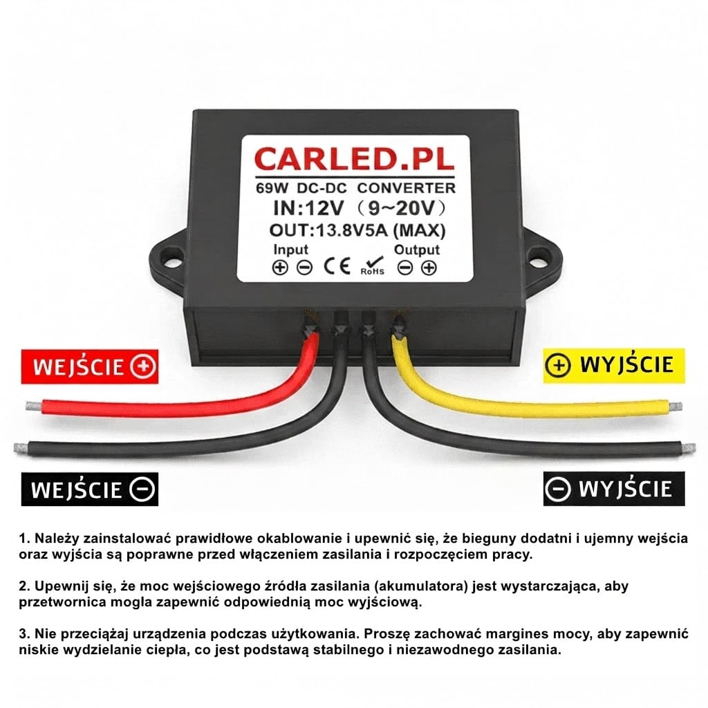 • Wysoka wydajność i moc: Maksymalny prąd wyjściowy wynosi 5A, co przy napięciu 13.8V daje moc całkowitą do 69W. Sprawność konwersji wynosi aż ≥93%.